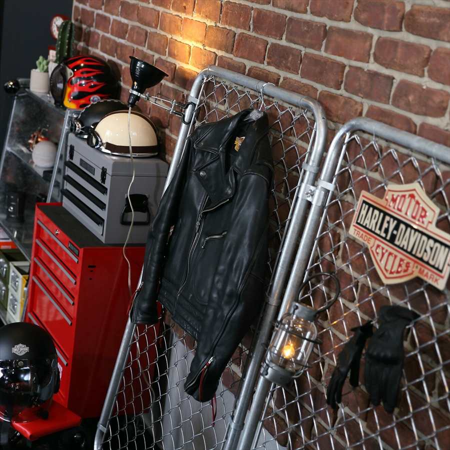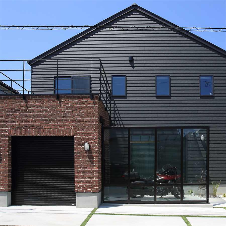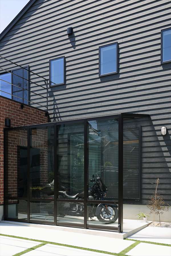 ■黒のラップサイディングとヴィンテージ感漂うレンガが印象的な外観。まるでショーウィンドウのようにバイクがディスプレイできるスペースがポイント