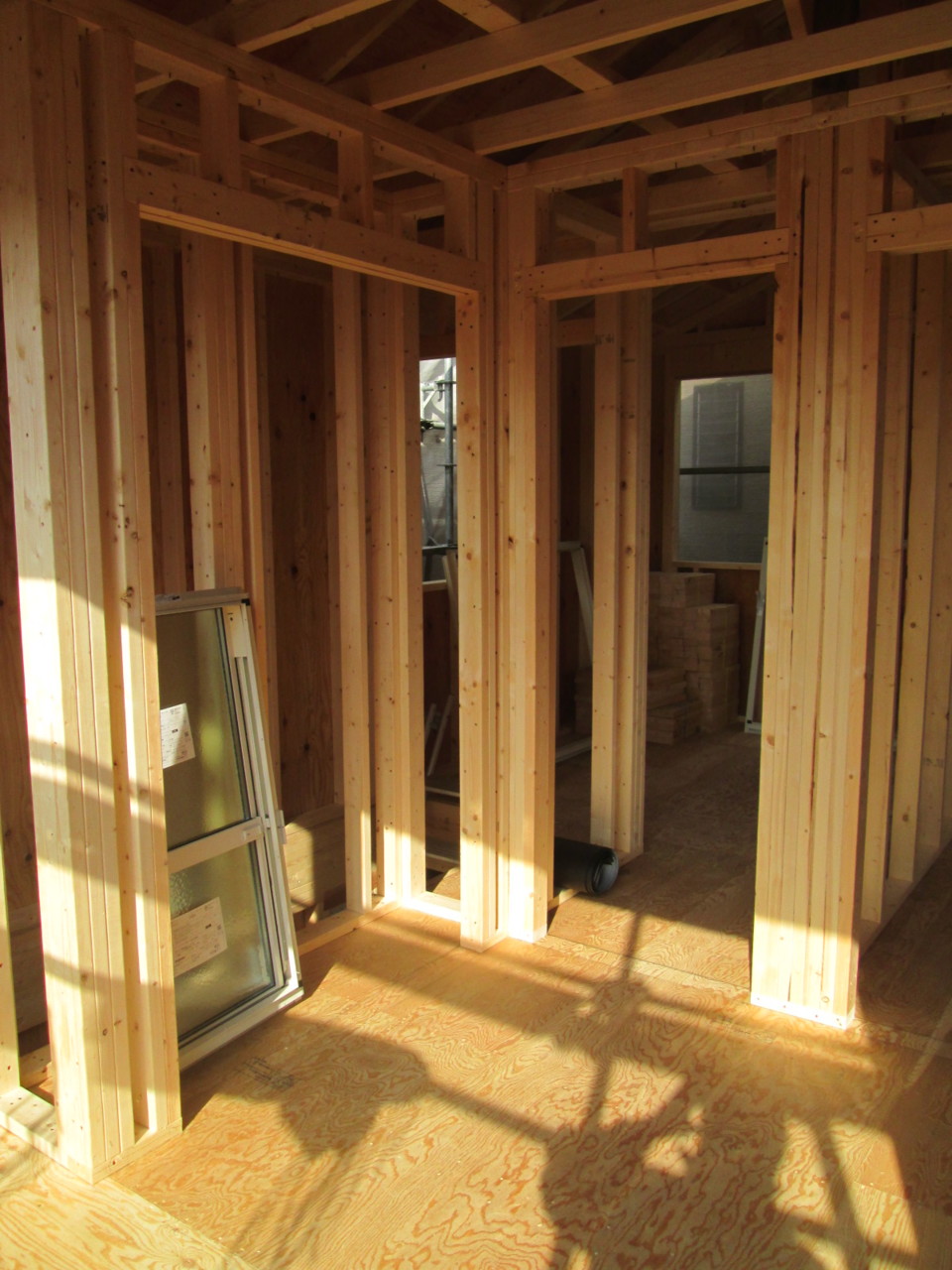 透湿防水シートが施工されました。このシートは文字通り壁の中の余分な湿気を外に出し、雨からは家を守ってくれます。透湿防水シートは外壁を張ると見えなくなりますが、重要な部分ですので、丁寧に施工致しました。