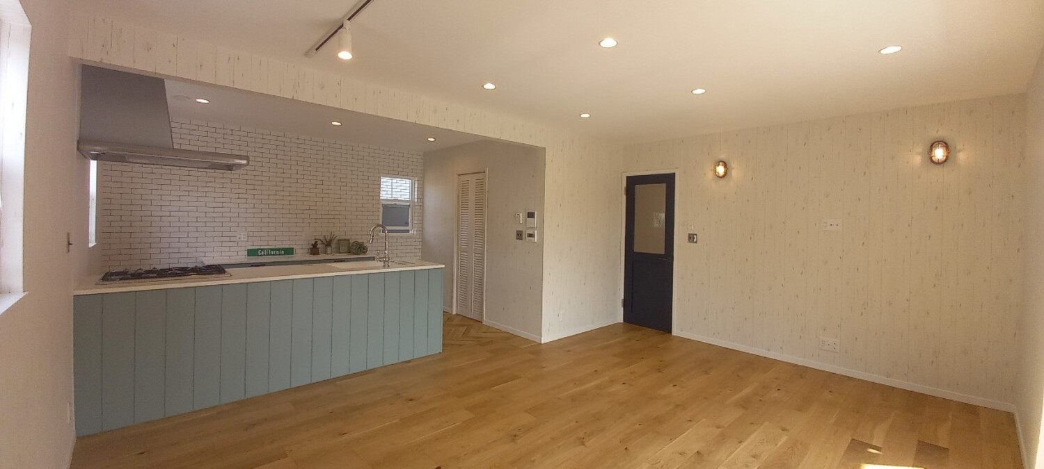 インテリアには明るいイエロー、キッチンのブルー等 目を惹く楽しい色使いに加え、木目柄クロス&タイル柄クロスをLDK壁全体に使う遊び心のある上級コーディネート。キッチンの床はヘリンボーンのフロアタイルにすることにより、水の飛び散りも気にならなくなりました。