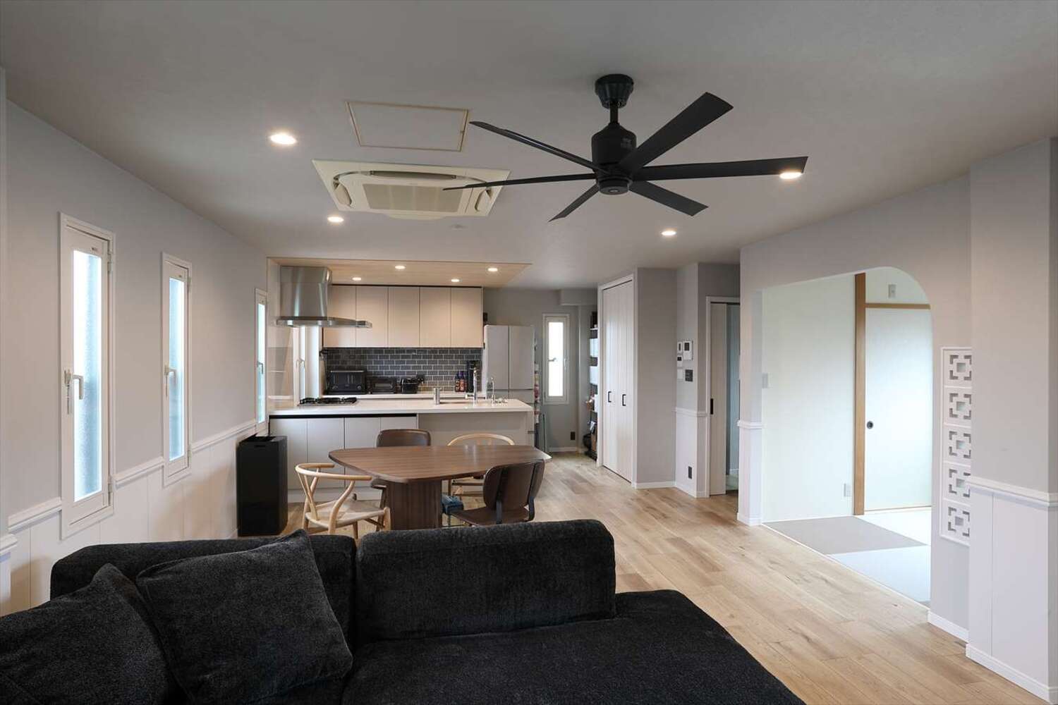 内部は間取りを大幅に変更。増築部分にキッチンを移動させて、家電類や食器棚は壁一面の収納内におさめるように設計しました。キッチンが移動したことで、リビングダイニングも広くなりました。また、リビング隣の元々和室だった部屋は、洋室にリフォーム、クローゼットも新たに作り、寝室として使っていただけるように用途替え。