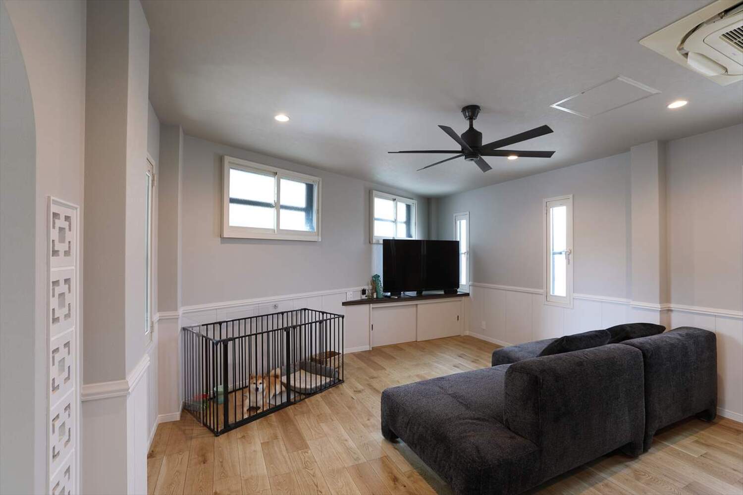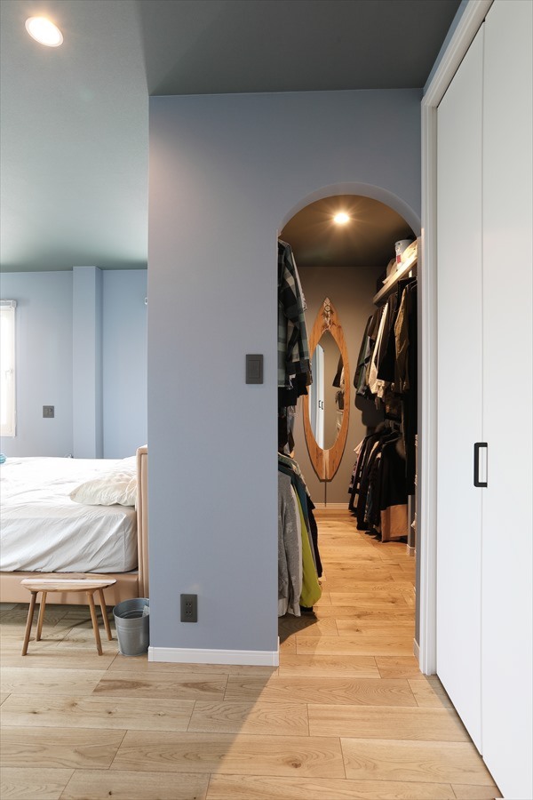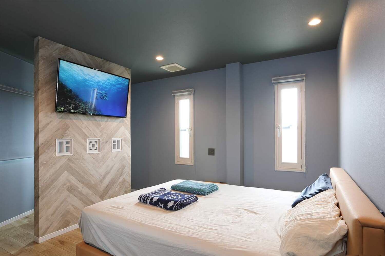 主寝室には大容量ウォークインクローゼットと、ヘリンボーン×花ブロックのアクセント壁を造作。TVも壁掛けできるデザインで、美しく機能的な空間に仕上げました。