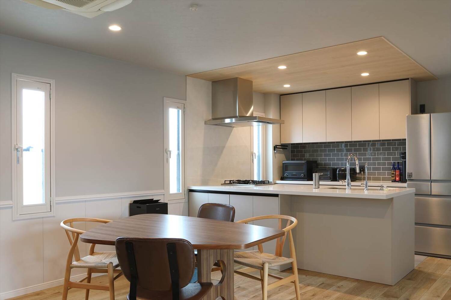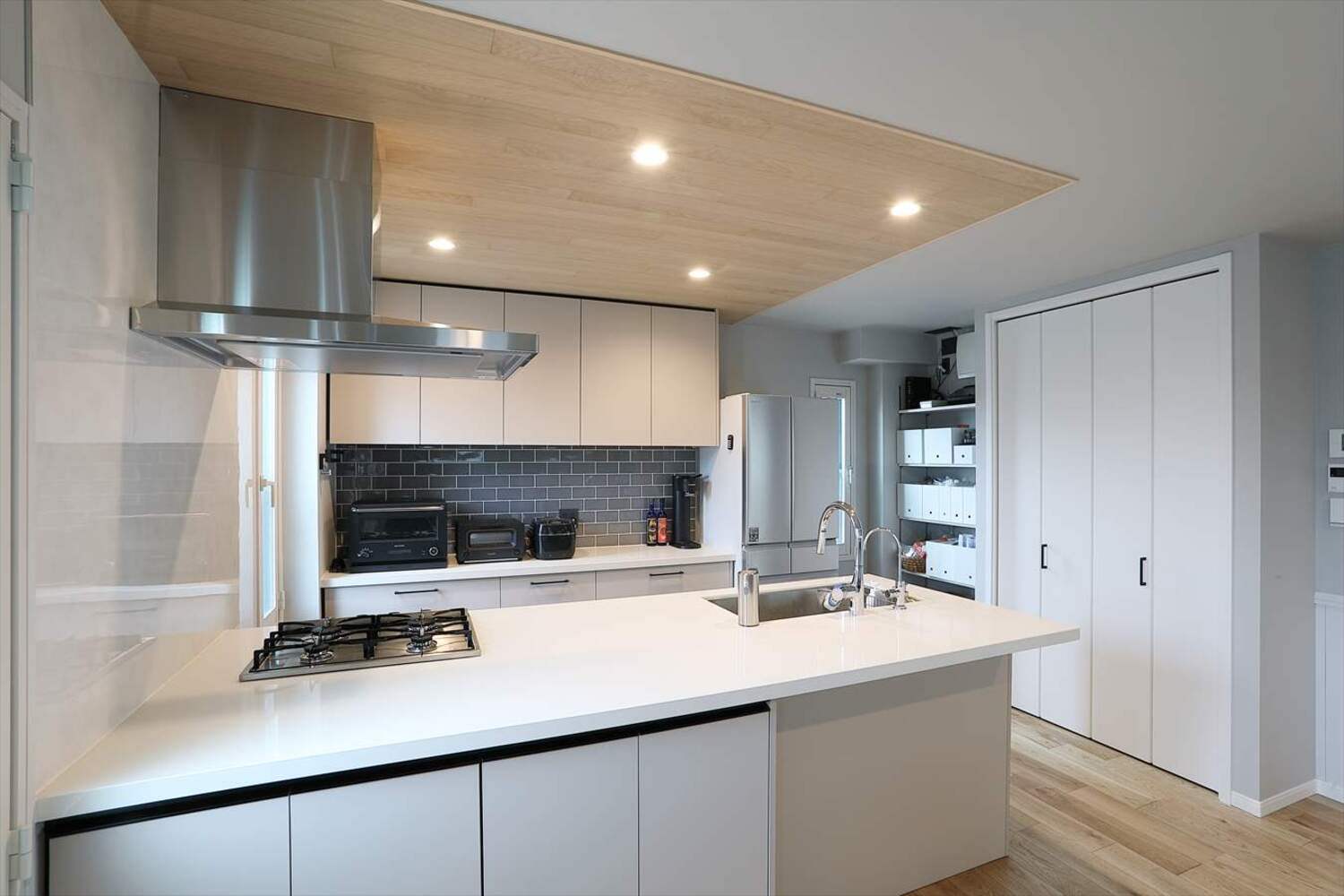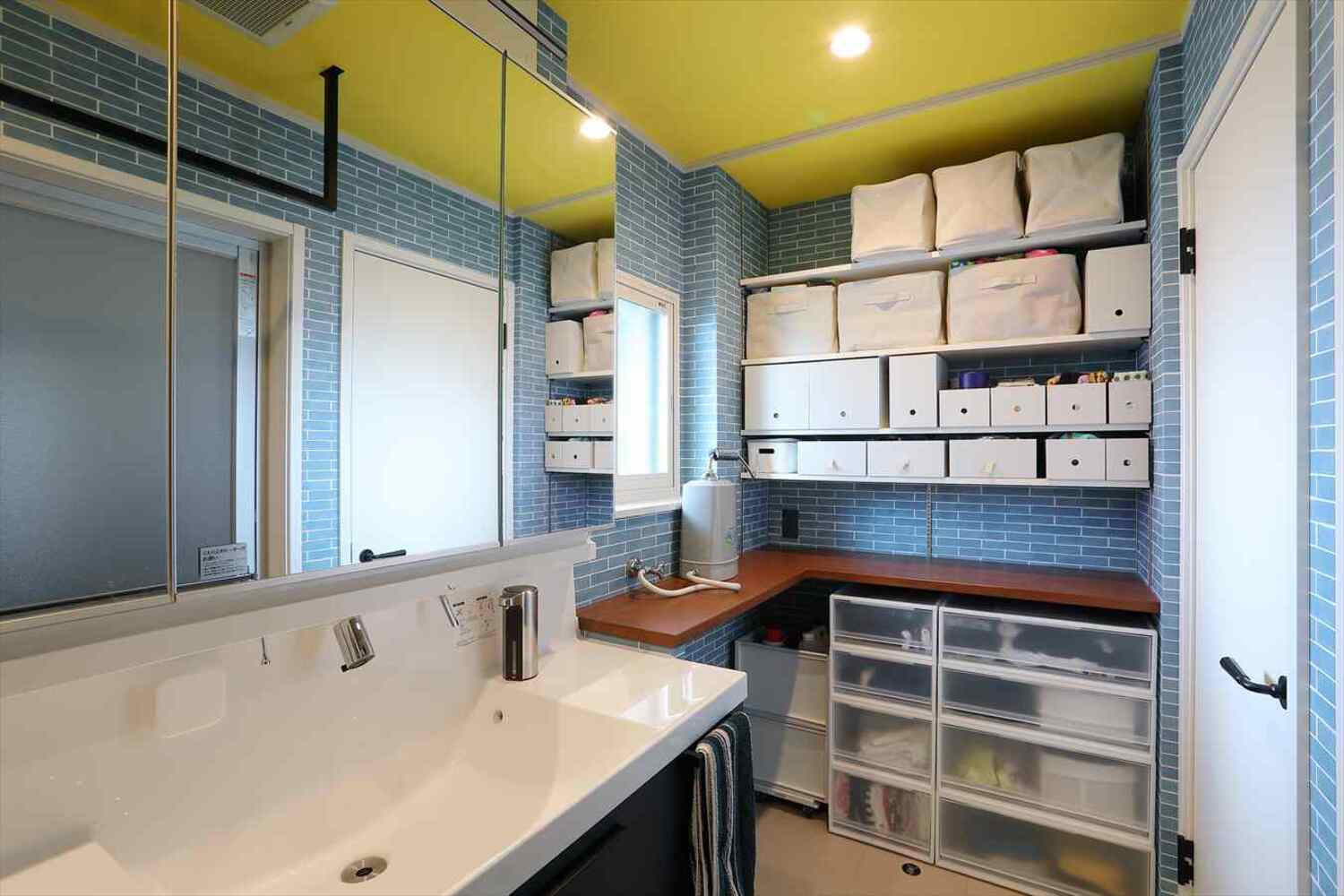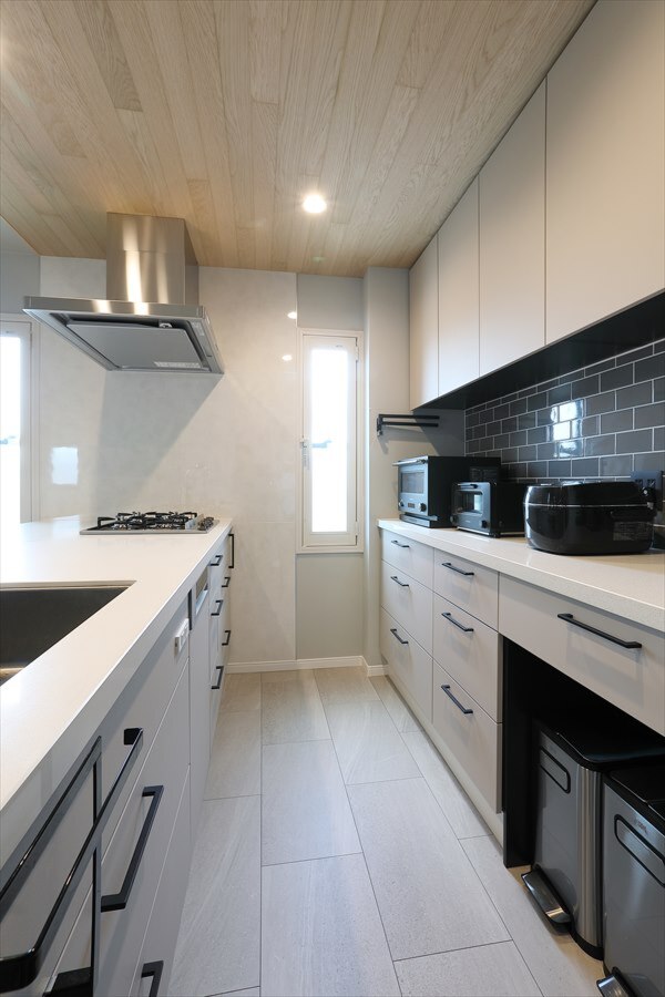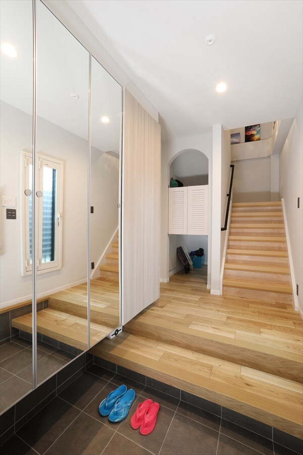 2Fリビングには床暖房、浴室暖房やガス乾燥機も設置し、冬も快適に。玄関まわりは収納量を増やし、ミラー効果で広々とした印象に。階段下のデッドスペースも有効活用しています。