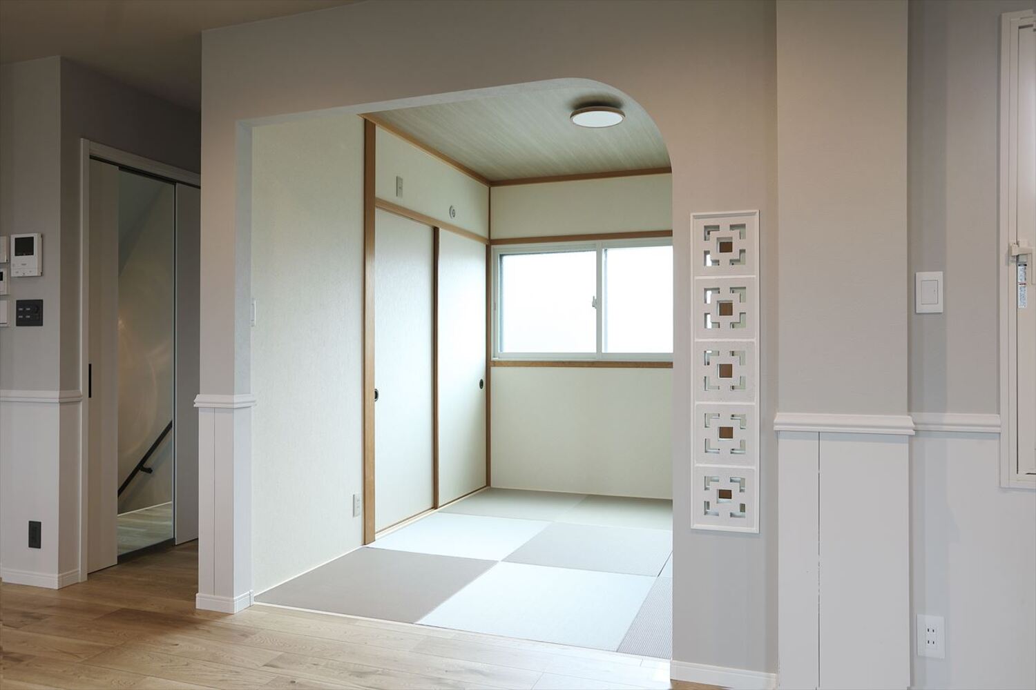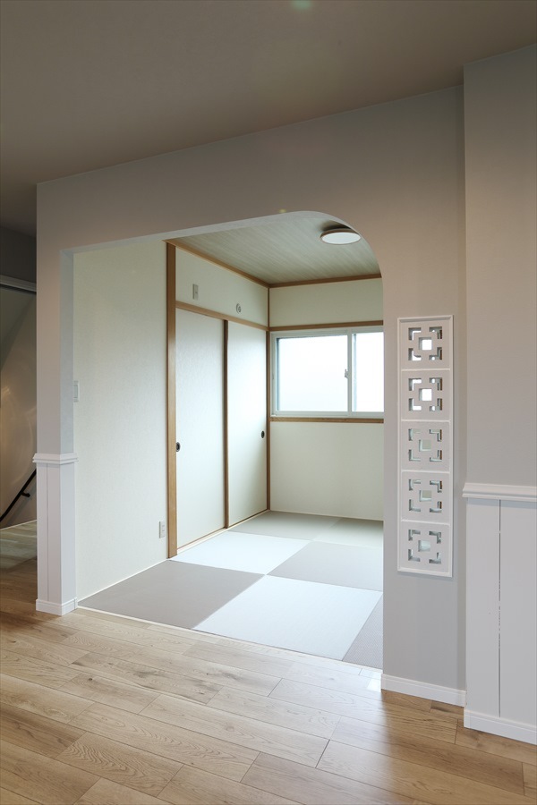 LDKはオープンキッチンに変更し、パントリーを新設。特にお客様こだわりの輸入オーダーキッチンは、食洗機や浄水器など設備機器も厳選し、デザインと機能性を両立しました。既存の腰壁は塗装でイメージチェンジ。リビング続きの和室はふすまを取り払い、アーチと沖縄の花ブロックで開口をつくり、リゾート感を演出しています。